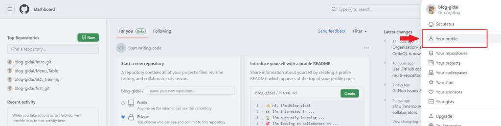 アカウントを開いたら、右上にある自分のアイコンから「 Your profile 」をクリックしてください。