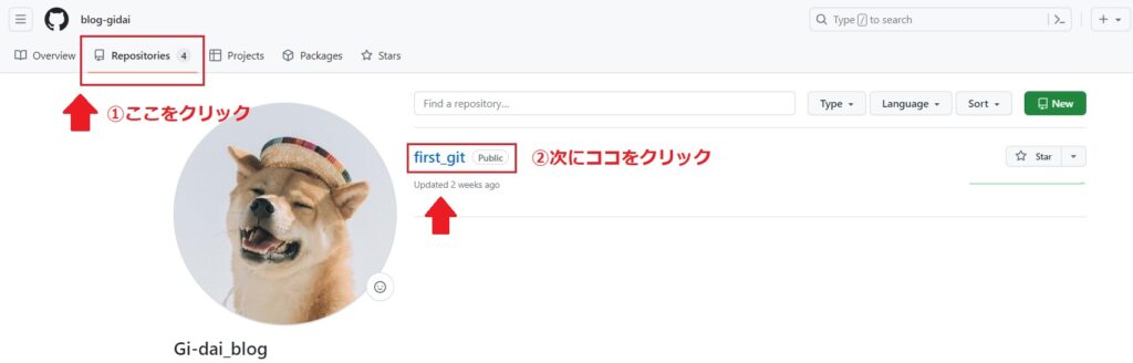 次に、左上の「 Repositories 」をクリックして、前回使用した「 first_git 」をクリックしてください。