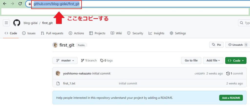 URLのコピーができたら、Git Bash を開いて、今までの章で使用してきた first_git ディレクトリーに移動してください。