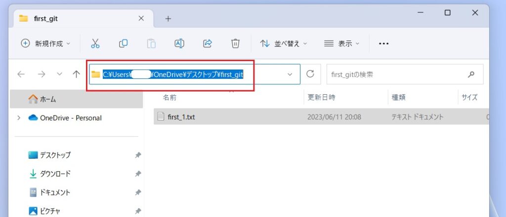 移動できましたら、フォルダー内に作成したテキストファイルがあるかを確認してみます。