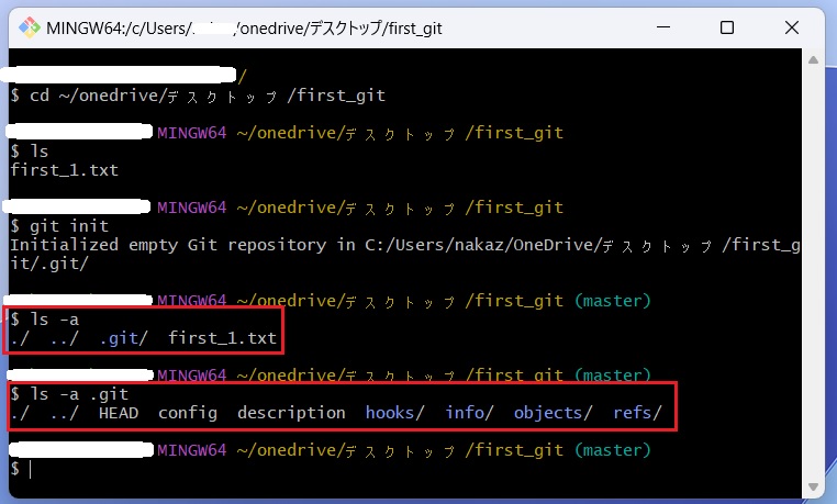 「 git init 」と入力することで、【 .gitディレクトリ 】が作成されているとも理解しておいてください。