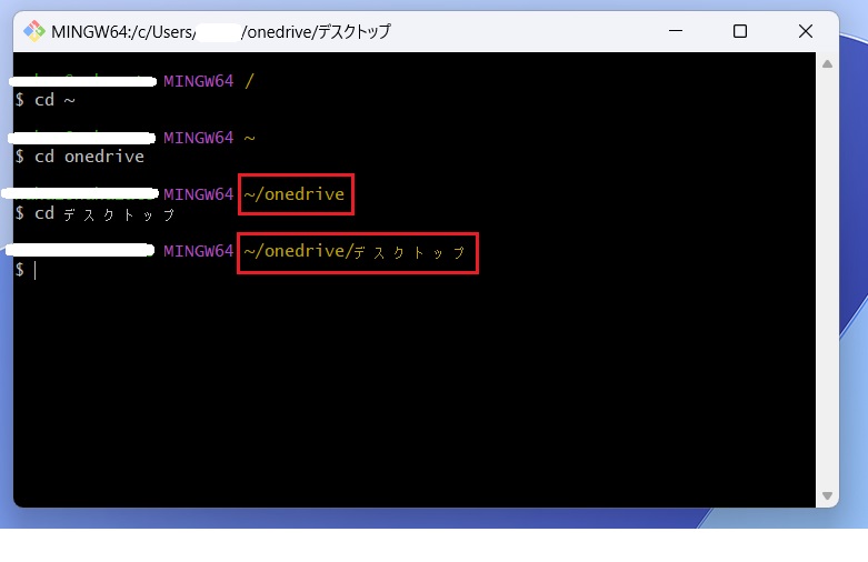 私の場合は、「 cd ~/onedrive/デスクトップ/ 」で移動できました。
