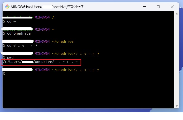 それが、最初に記載した「 cd ~/onedrive/デスクトップ/ 」です。