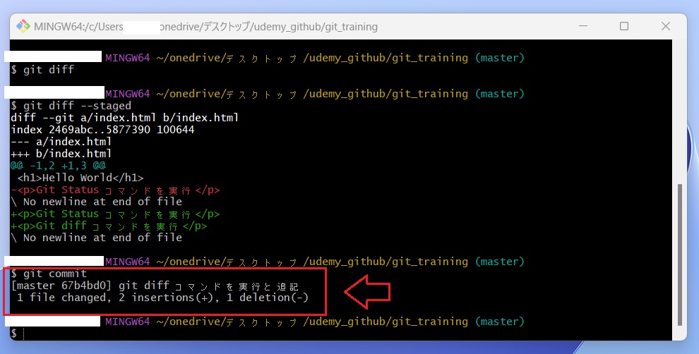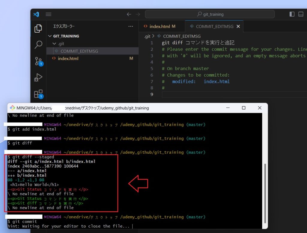 GitBashにて「 git commit 」と入力してコミットメッセージを「 git diff コマンドを実行と追記」と入力してください。
