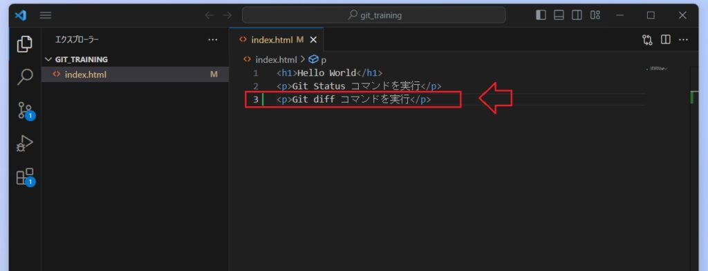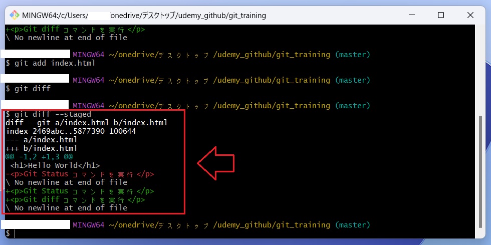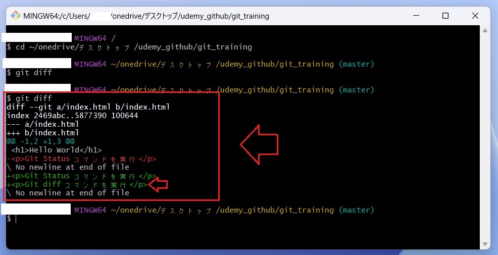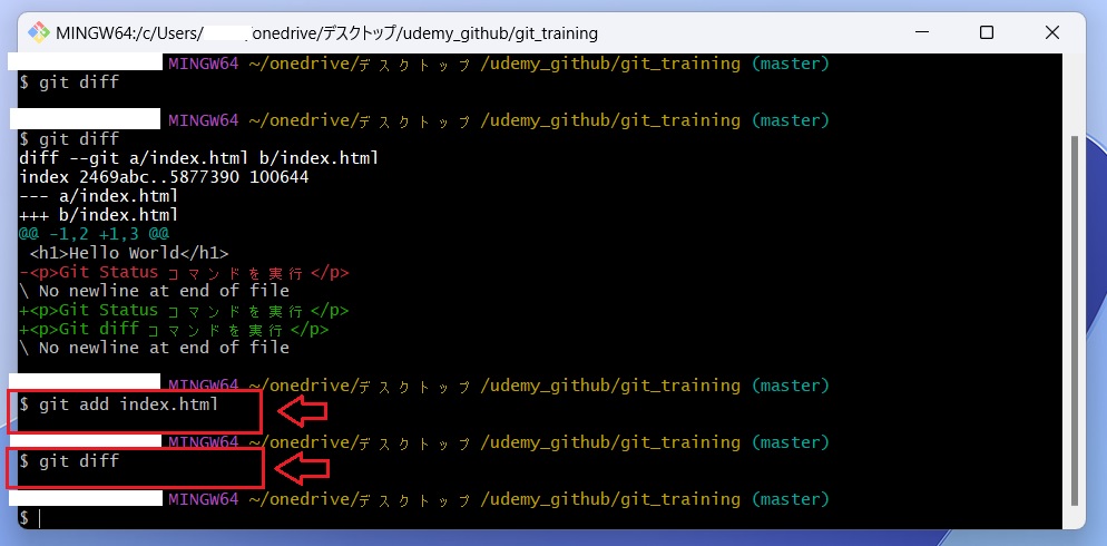 「 git add index.html 」と入力した後に「 git diff 」と入力してください。