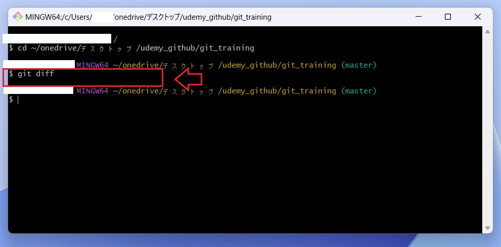 ファイルが変更できたら、再度 GitBashにて「 git diff 」と入力してください。