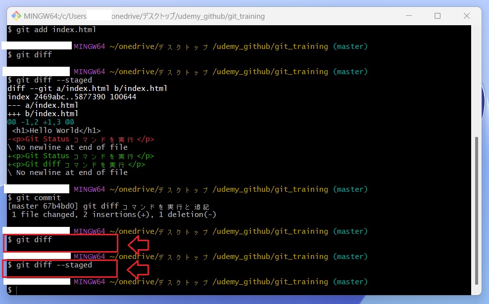 それでは最後に「 git diff 」と「git diff –staged」を入力して何も表示されないことを確認しましょう。