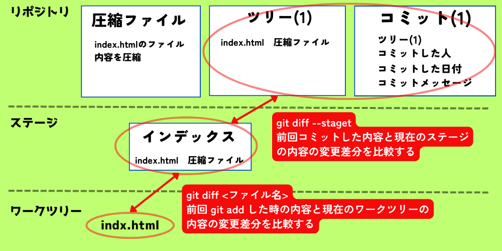 git diff –staged コマンドは、前回 git commit した内容と現在のステージの内容の変更差分を比較する事なります。