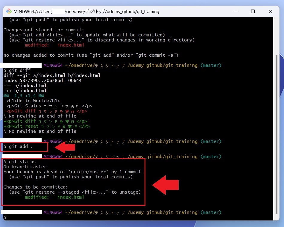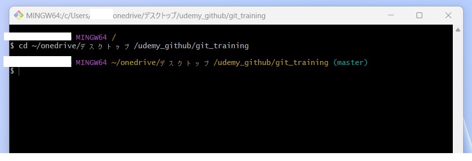 GitBash を立ち上げたら、前回の記事(⑱ファイルの変更を取り消す)で使用した「 git_training 」のディレクトリに移動してください。