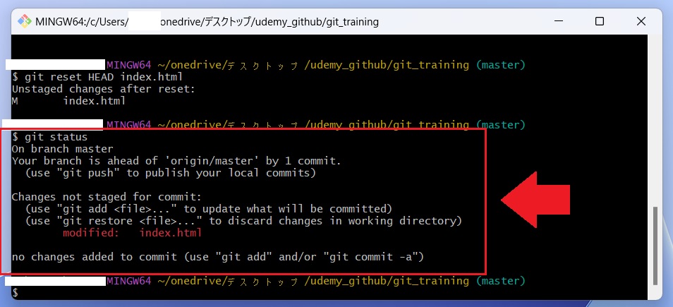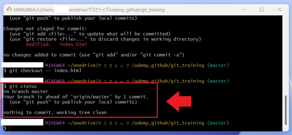 GitBash にて「 git checkout — index.html 」と入力してください。