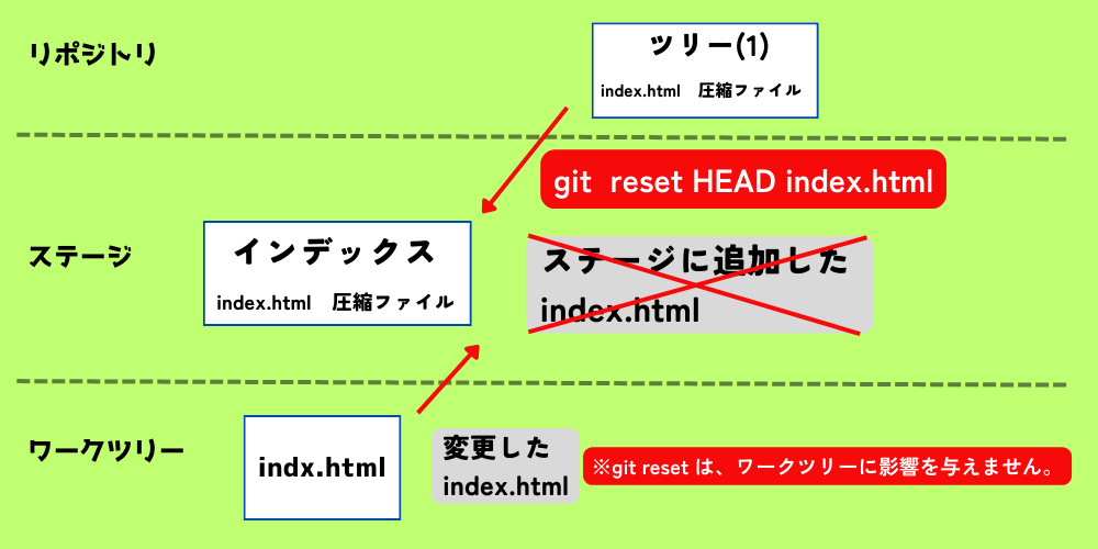 Git で起きている事は、ステージの状態を最新の(直近の)コミットの状態に上書きしている(同じ状態にしている)という事が行われています。