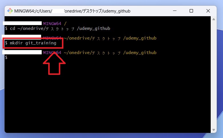 ディレクトリの移動ができましたら「 mkdir git_training 」と入力して今回使用するディレクトリを作成します。