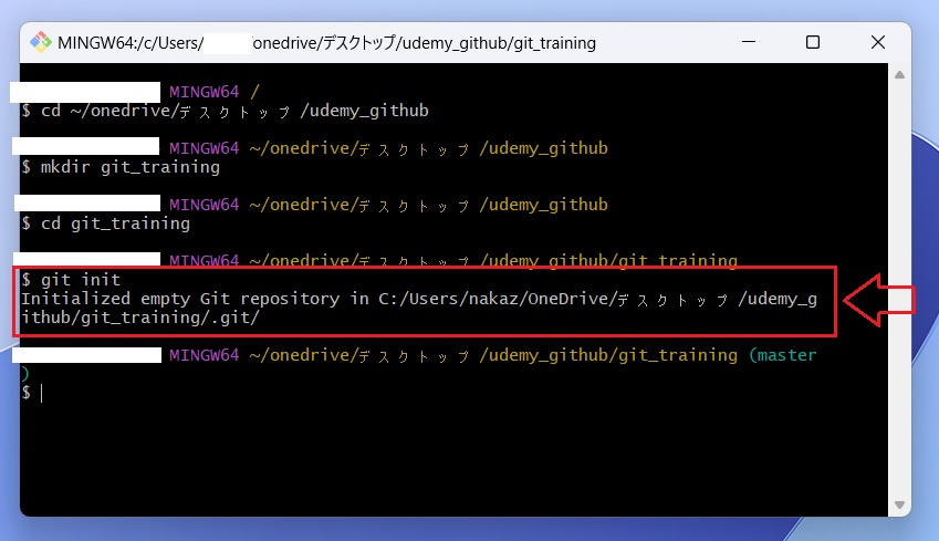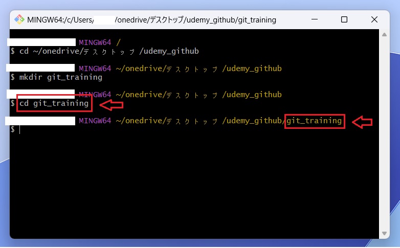 ※上記画像でも udemy_github から git_training のディレクトリに移動した事が分かると思います。
