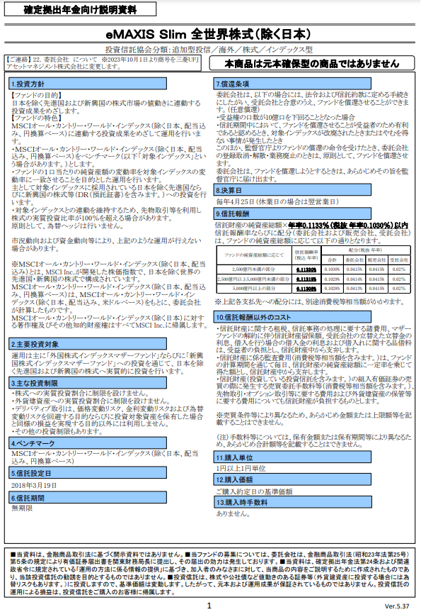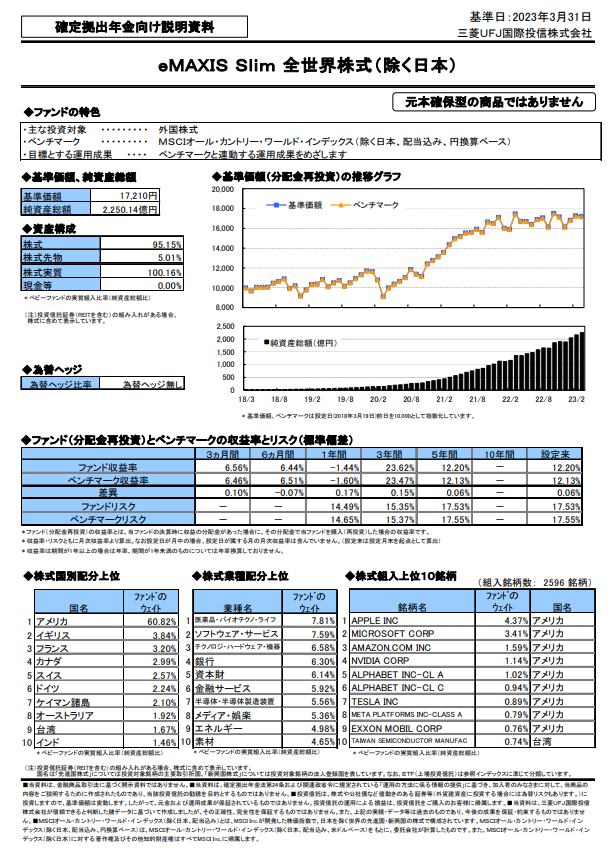 私のiDeCoはSBI証券を利用していますので、管理ページにUPされていた「eMAXIS Slim全世界株式(除く日本)」の2023年3月の資料を添付します。