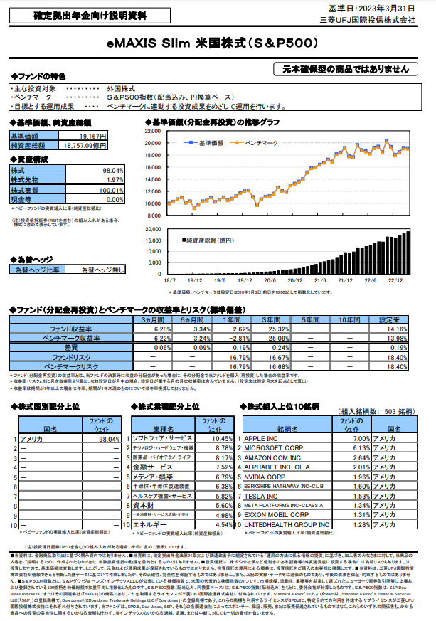 私のiDeCoはSBI証券を利用していますので、管理ページにUPされていた「eMAXIS Slim米国株式(S&P500)」の2023年3月の資料を添付します。