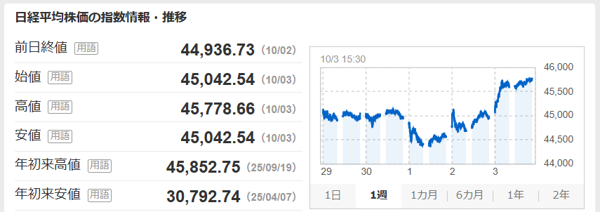 日経平均が大きく落ち込みかけていましたが、週末に45,000円台まで回復しています。